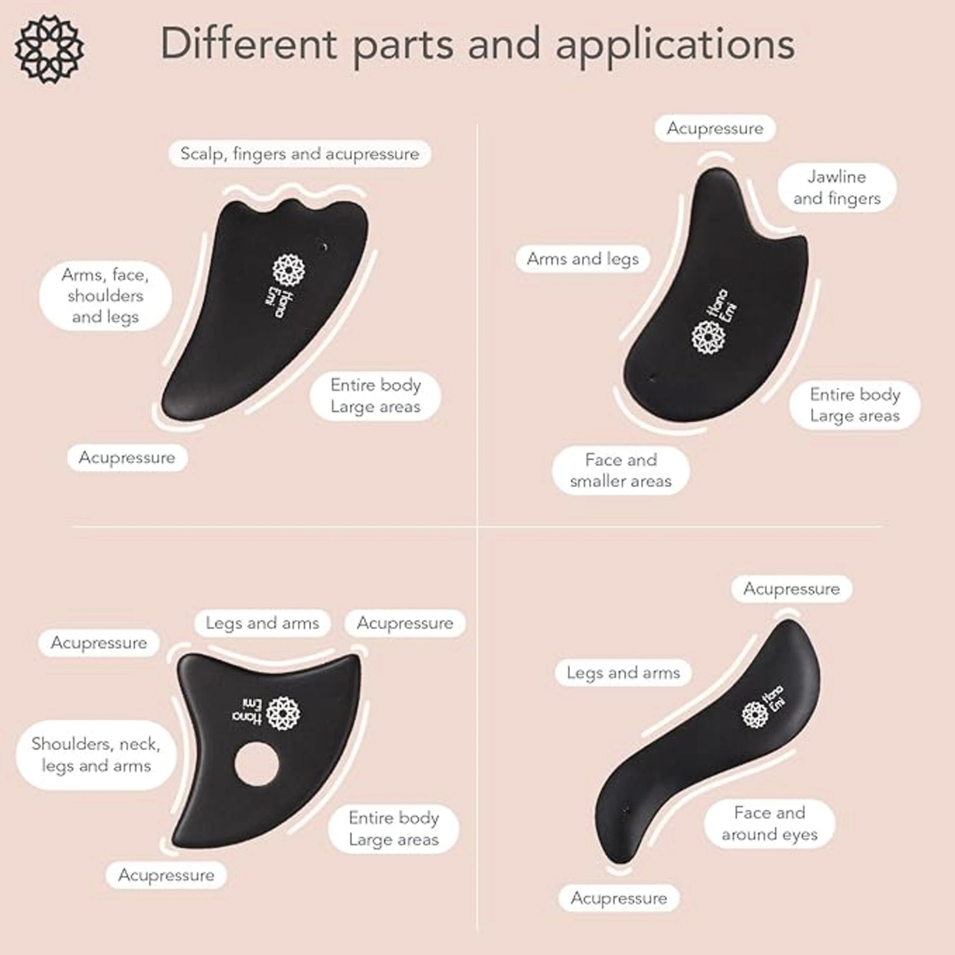 Gua sha tools improve blood flow, detox your body, reduce wrinkles, help with headaches and, much more. Sibin bianstone is considered the best material for scraping tools, trigger point therapy, and taking excellent care of your skin, they are comfortable to hold and use. (Stone names ordered in photo: Heart, Wave, Wing, Point)